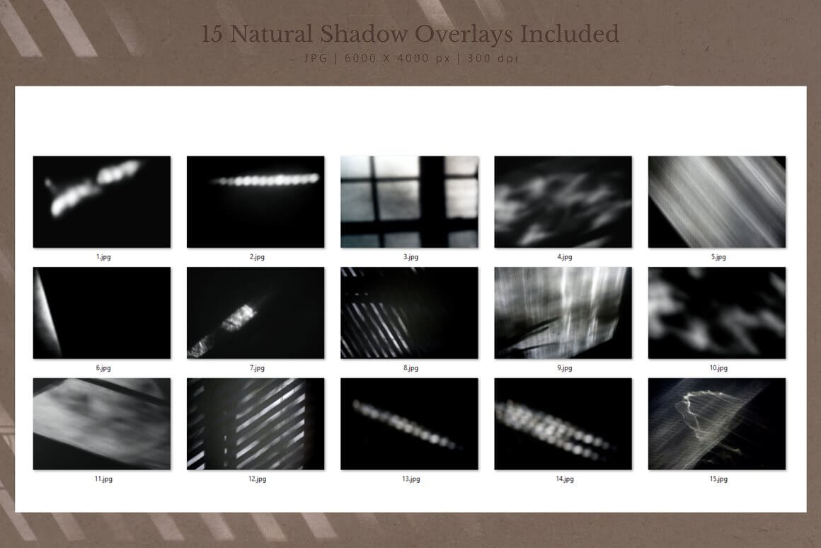这些自然阴影 JPG 叠层可用于您已经拥有的许多样机或库存照片图像。只需将混合模式调整为正片叠底或线性加深,然后将不透明度调低,直到获得所需的自然效果。