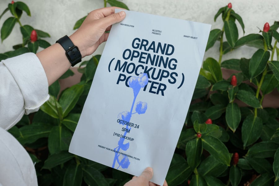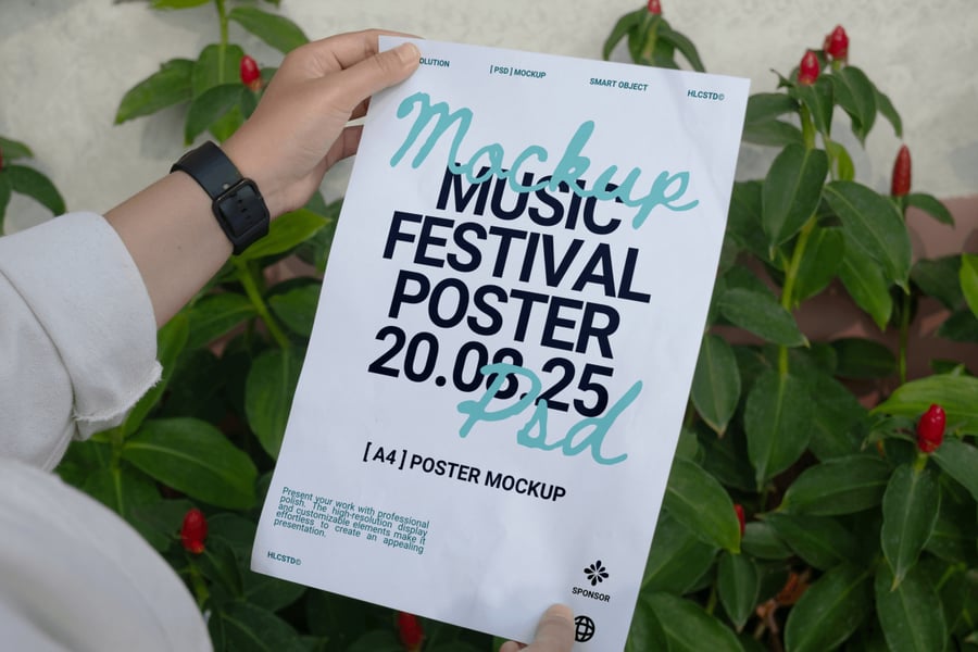 用这张**A4户外海报样机**捕捉新起点的兴奋,非常适合用于活动公告。海报以郁郁葱葱的绿叶为背景,为您的设计增添了活力和成长的感觉。自然环境增添了活力和温馨的感觉,使其成为注重环保的企业或在户外举办活动的绝佳选择。高分辨率图像和专业的构图将确保您的宣传材料无论是用于客户演示还是社交媒体活动,都引人入胜且精美绝伦。