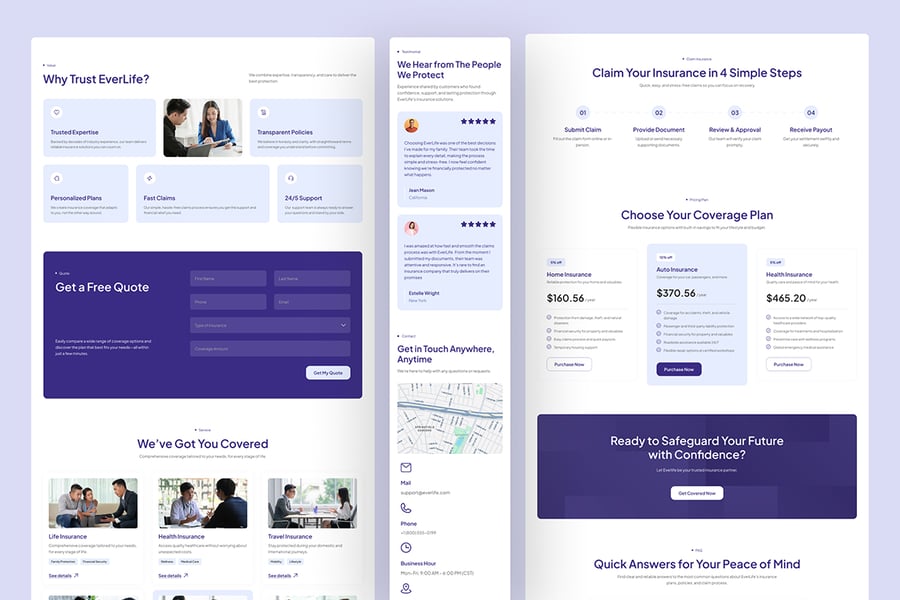 EverLife 的设计理念围绕真实用户如何在线探索保险选项而构建。从详细的服务说明到可视化的比较表和即时咨询表单,每个设计元素都经过优化,以降低跳出率并促进注册。无论您是构建新网站还是改造旧网站,此模板都能为您提供可靠的基础,打造极具说服力的数字体验。凭借直观的导航和增强信任的设计,它帮助用户在决策过程中获得更多信息并充满信心,最终提高参与度和转化率。