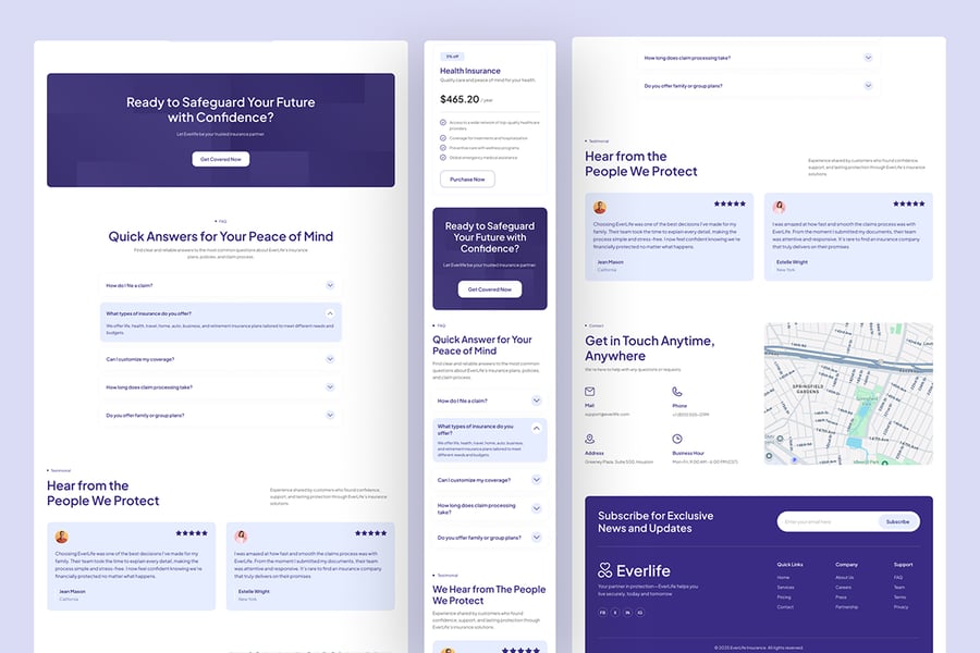 使用 EverLife,安心保障未来。EverLife 是一款现代专业的保险登陆页面 UI 模板,旨在建立信任、吸引咨询并推广服务。该模板采用 Figma 设计,提供桌面和移动端视图,帮助保险提供商、财务顾问和保障计划机构清晰可信地展示其产品。