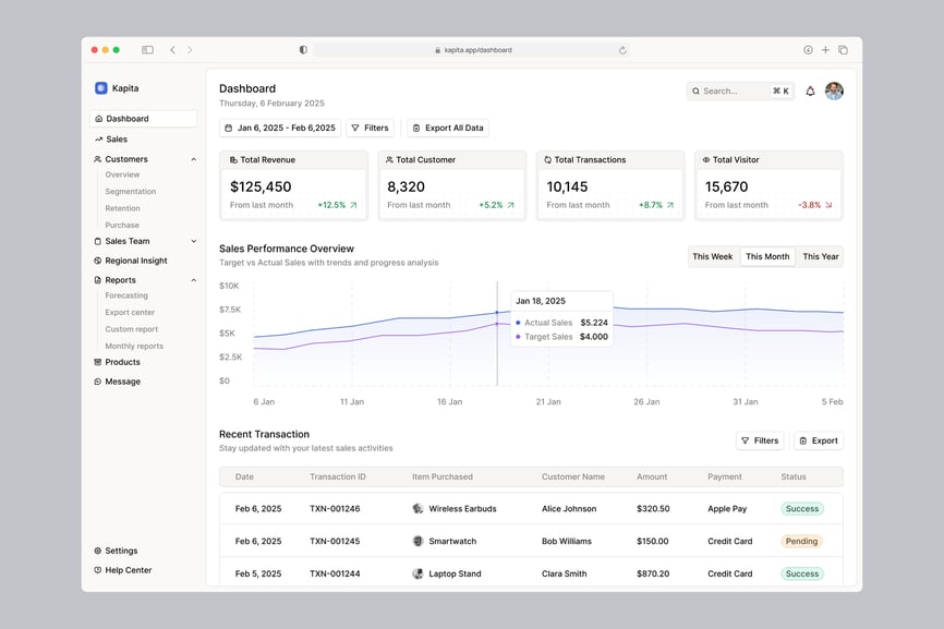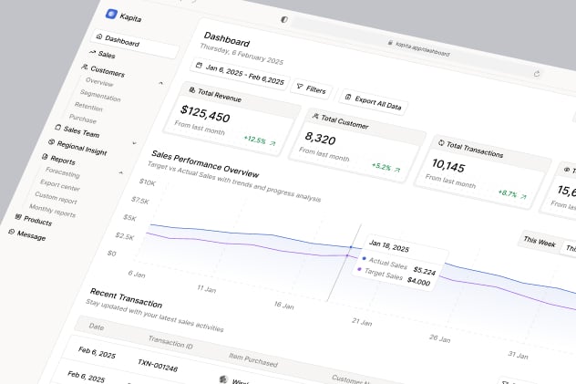 此财务销售仪表板 UI 模板旨在帮助企业、初创公司和分析师在清晰现代的界面中跟踪收入、销售业绩、客户洞察和交易。凭借结构良好的布局和简洁的排版,此模板可改善数据可视化并增强决策能力。