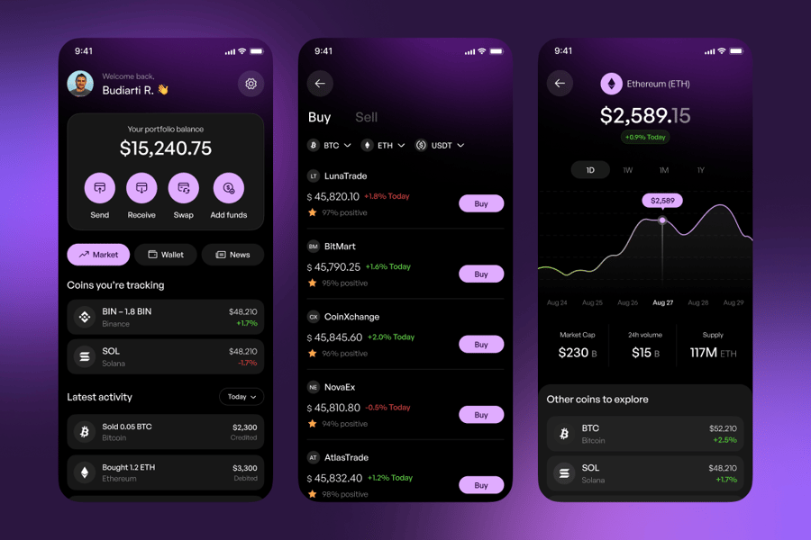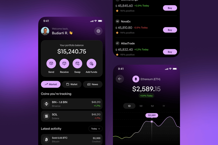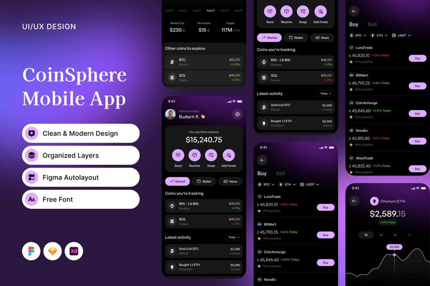 CoinSphere – 加密货币移动应用 UI 套件是一款现代专业的设计模板,用于创建数字钱包、加密货币交易和财务管理应用程序。它采用时尚的深色界面,提供用于追踪加密货币、发送/接收加密货币、查看市场趋势和管理投资组合的布局。