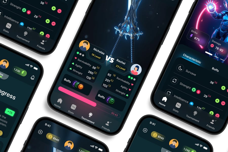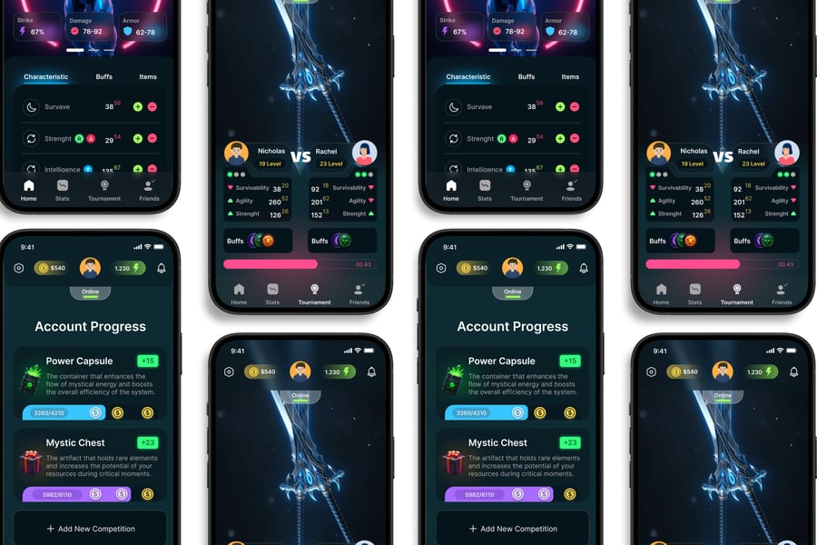 **Battle Game** UI 套件的设计注重易用性和一致性,让您轻松创建美观实用的移动应用。每个元素都经过精心设计,完全可自定义,并可根据您的品牌进行调整。无论您是设计社交应用、电商应用还是生产力工具,此套件都能让您灵活地将创意轻松转化为现实。