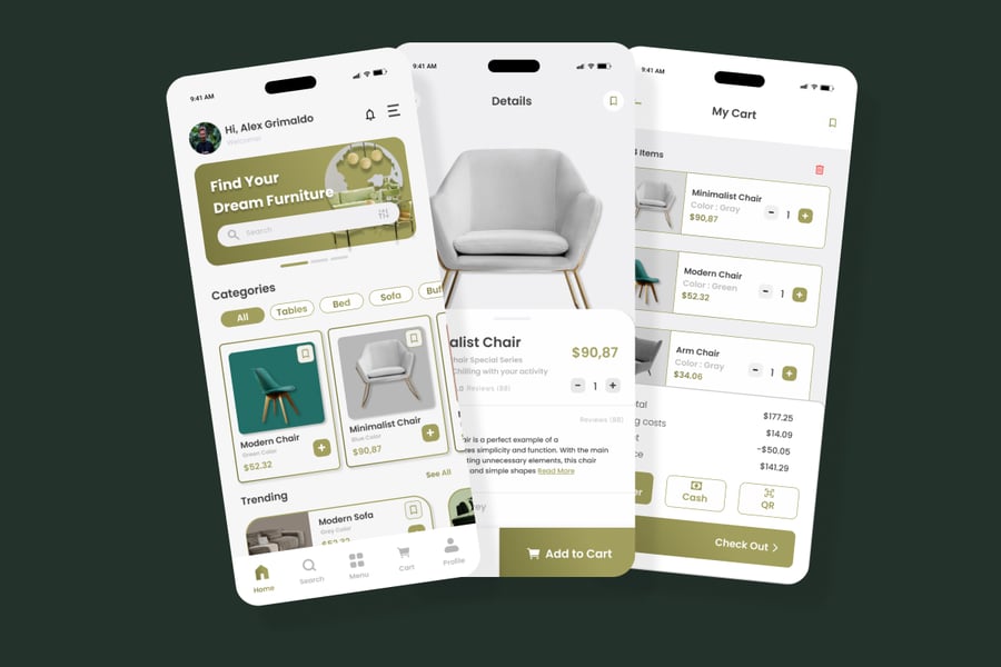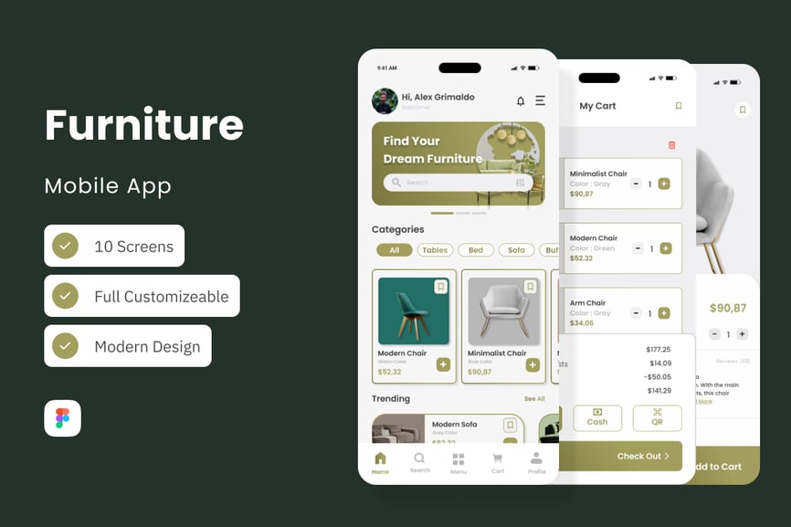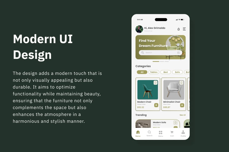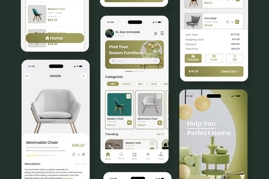 My Furni 设计简洁易用,专为优化家具浏览和购买体验而设计。该模板提供流畅的交互和引人入胜的视觉效果,是吸引客户和提升销售转化率的理想之选。不要错过让您的应用更专业的机会!