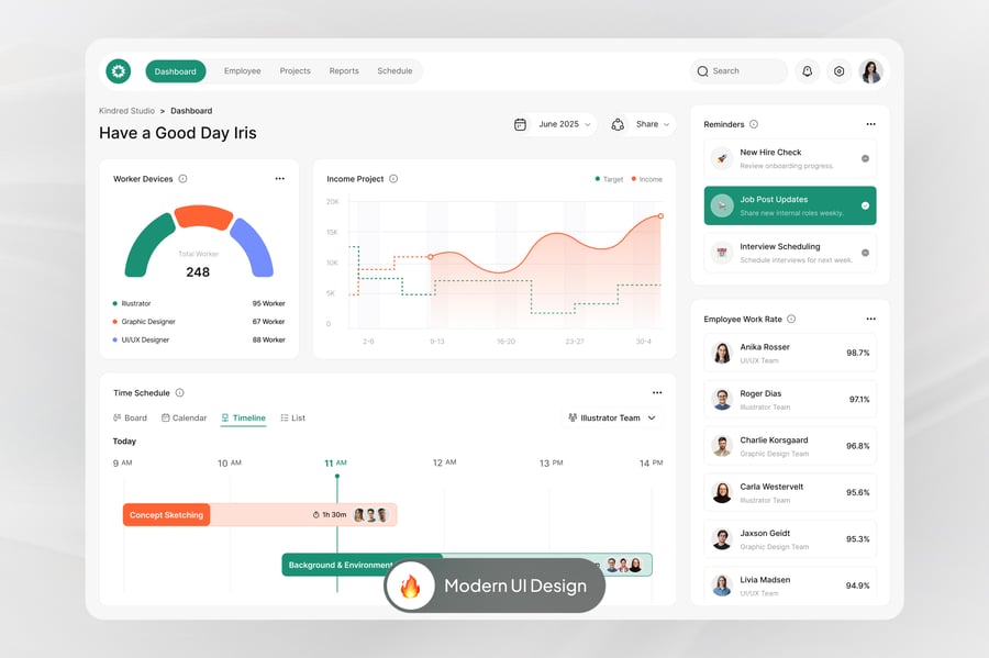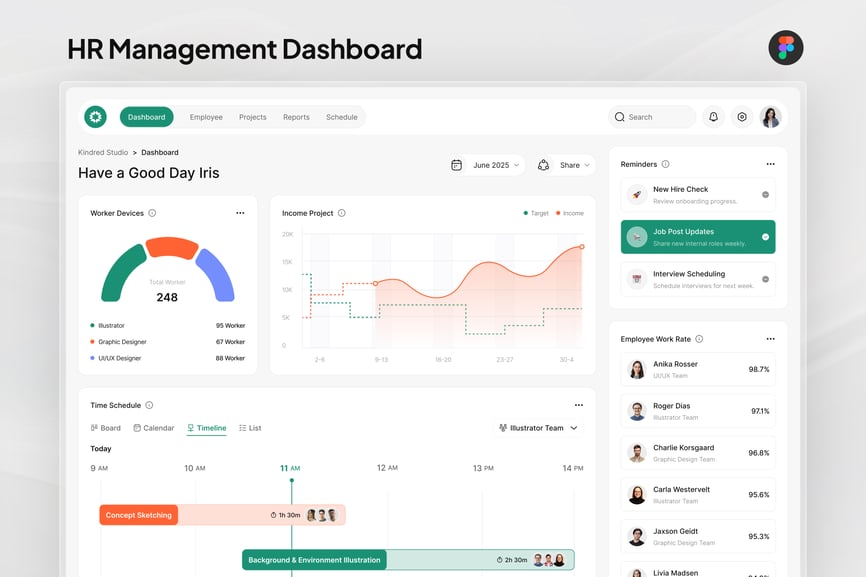 这款人力资源管理仪表盘让您清晰地了解员工队伍,提供招聘、敬业度和生产力方面的实时洞察。它凭借直观的导航和强大的分析功能,简化了复杂的人力资源流程,从而获得更佳成效。