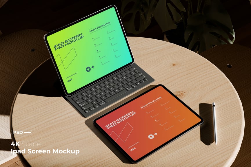 这款高分辨率 iPad 屏幕模型可在逼真优雅的环境中展示您的应用、UI 设计或网站。模型包含两台 iPad(一台带键盘,一台平放),放置在自然光下的木质圆桌上。模型包含智能对象图层,可轻松自定义,并采用 4K 分辨率,打造专业效果。非常适合用于作品集、UI/UX 演示或数字产品展示。
