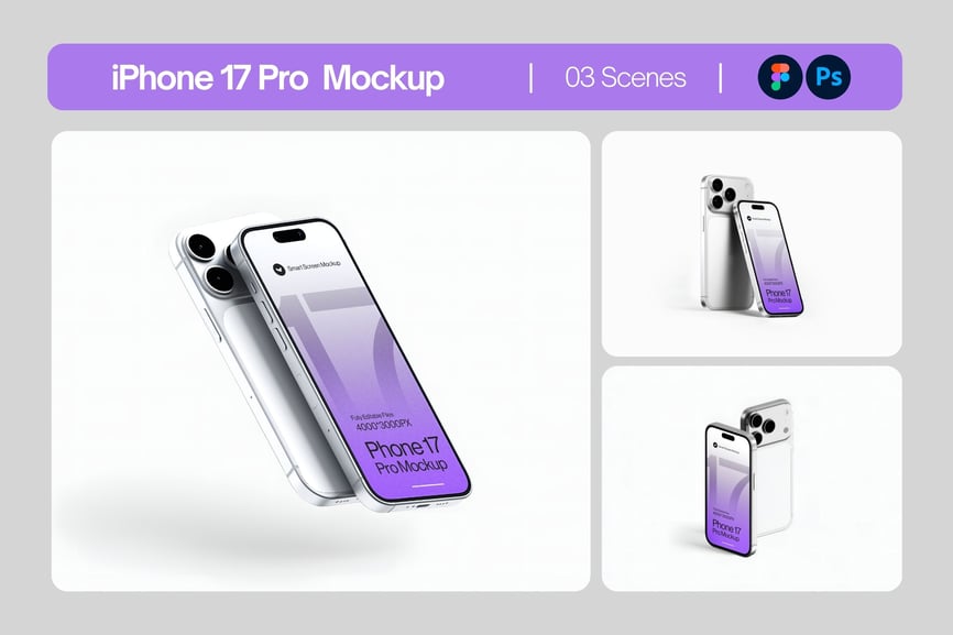 **隆重推出 iPhone 17 Pro 智能手机屏幕样机套装——这是一款时尚现代的样机套装,旨在以 Apple 风格的高端外观展示您的移动应用、UI/UX 设计、网站和产品演示。该套装非常适合设计师、开发者、营销人员和电商品牌,可为您的项目提供逼真且专业的展示效果。**
