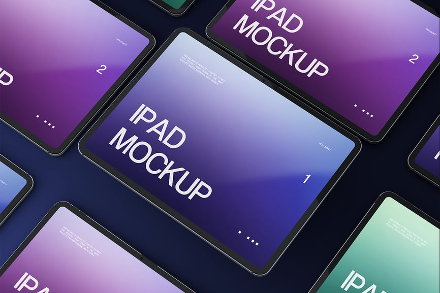 深色渐变背景上,排列着不同屏幕颜色的 iPad 组合成网格状。此布局非常适合在多屏幕上清晰统一地展示应用界面、数字产品、杂志排版或响应式网页设计。