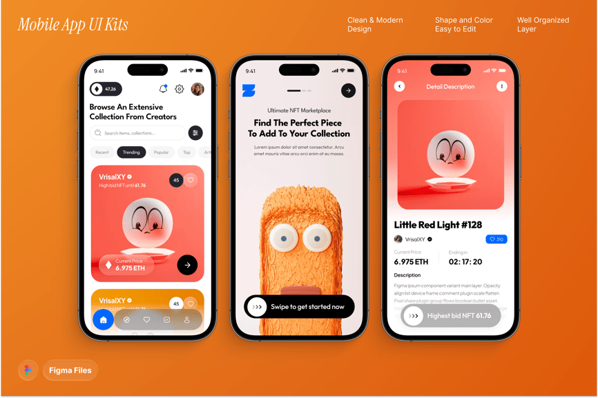 专为数字资产平台量身定制的现代化移动 UI 套件,支持无缝浏览、购买和销售 NFT。它拥有简洁易用的组件,非常适合初创企业、创意机构和致力于提供引人入胜用户体验的区块链项目。