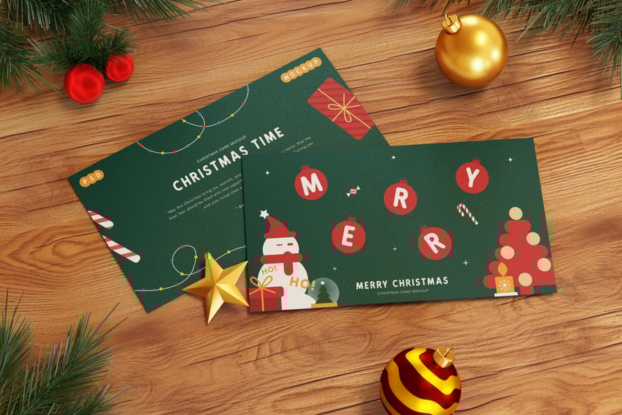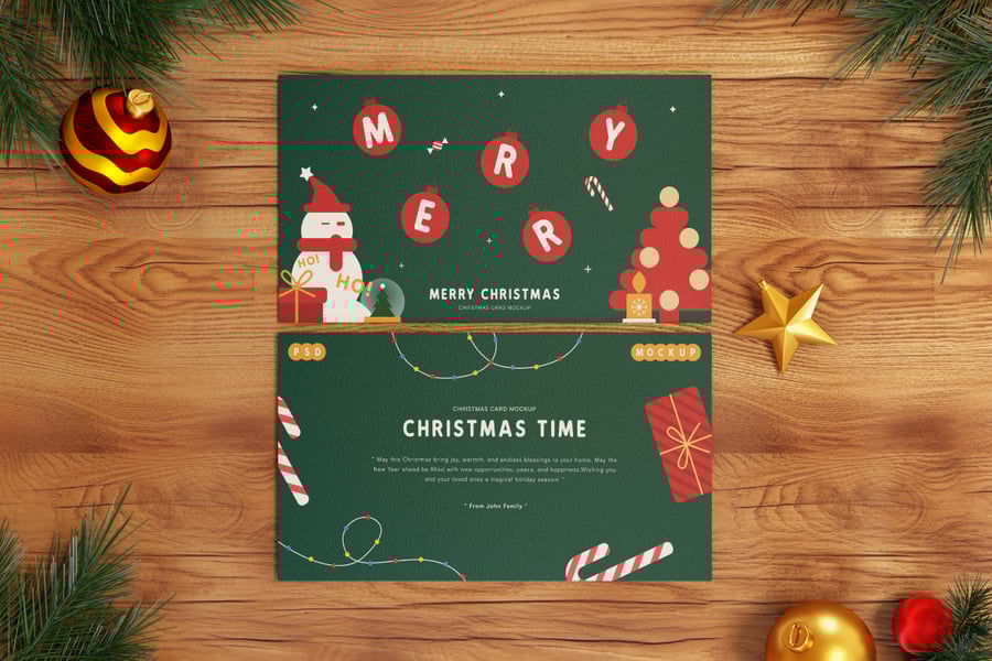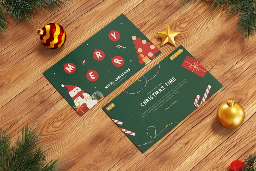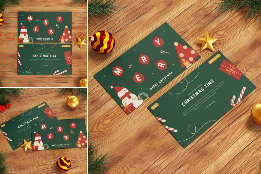 使用这款高品质圣诞贺卡样机模板,以喜庆而专业的方式展示您的节日贺卡设计。这款模板非常适合平面设计师、贺卡制作商和文具品牌,它包含多个视角,可以全面展示贺卡的正面和内页。逼真的阴影、装饰和木纹背景元素,让您的设计看起来可以直接打印和分享。