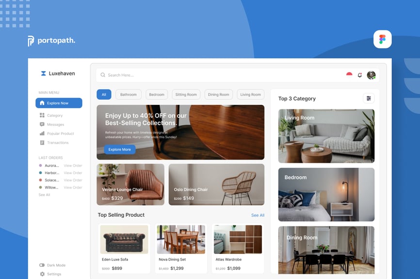 专为电商管理和分析设计的仪表盘 UI 模板。简洁的界面布局让用户能够无缝管理产品、查看销售业绩和分类。非常适合家具、家居装饰和生活方式商店平台。使用 Figma 构建,拥有专业直观的设计,注重易用性和视觉清晰度。非常适合设计人员、开发人员和初创公司创建管理仪表盘或 Web 应用。
