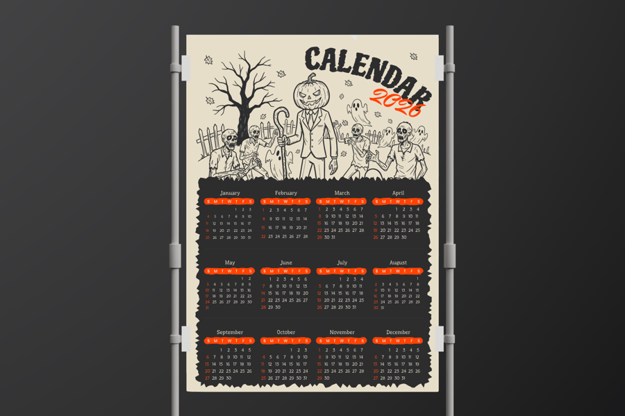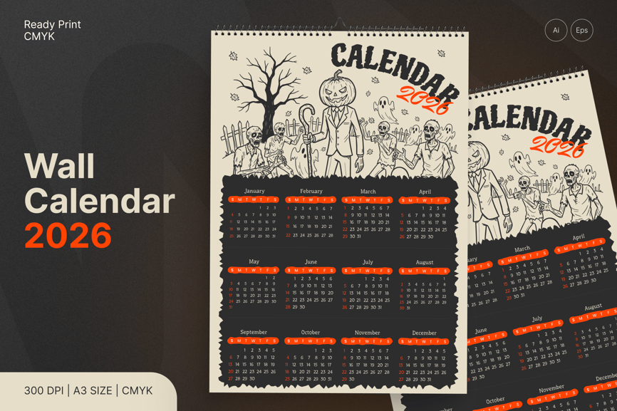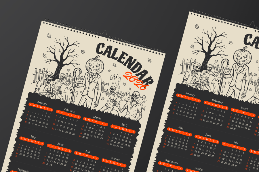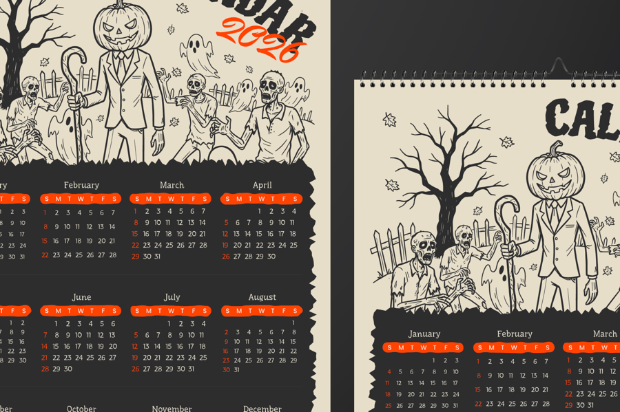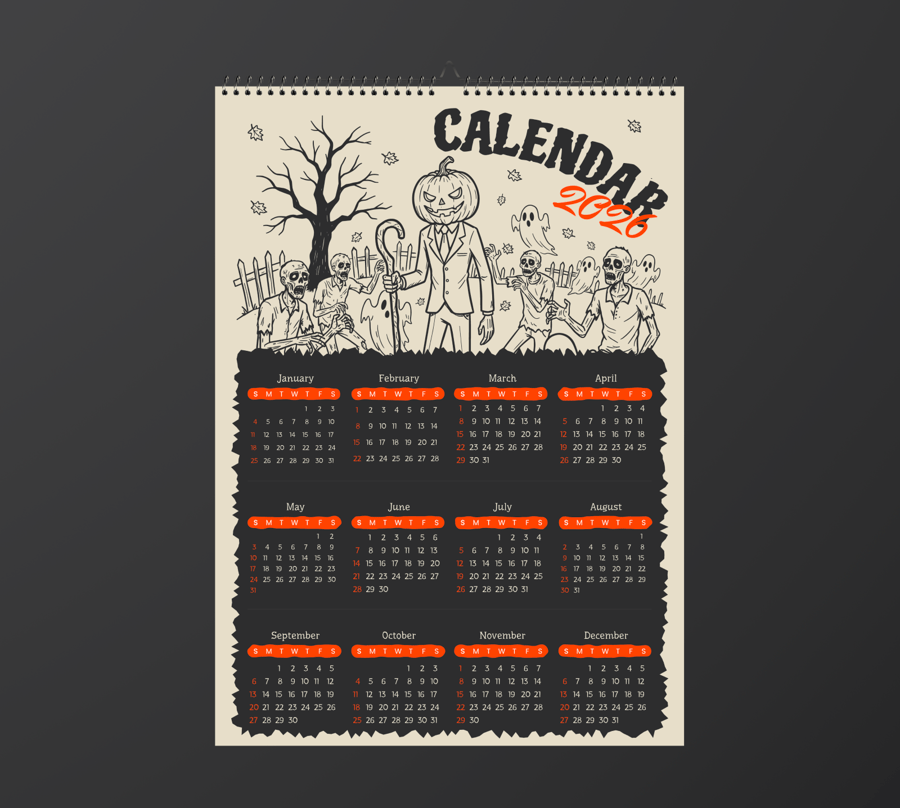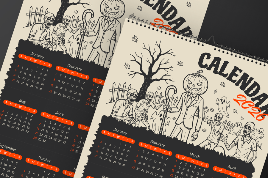 一款充满艺术感的日历,将恐怖风格的插画与时尚的布局巧妙融合。它不仅颂扬了万圣节的黑暗美学,还提供实用的年度计划。