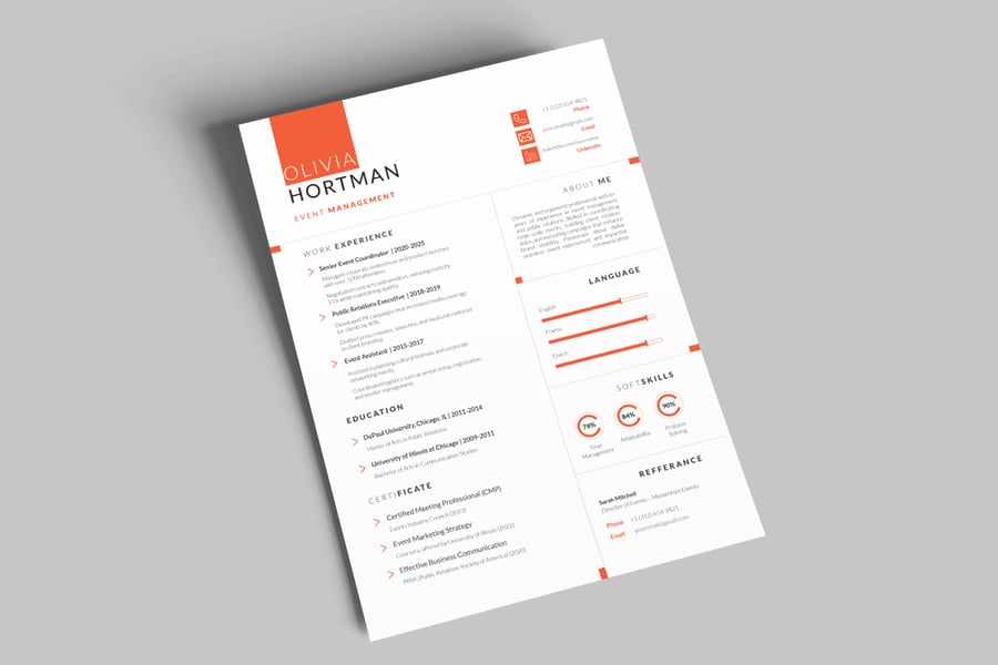 这款简洁、可编辑的简历模板专为希望给人留下自信自信第一印象的专业人士设计,定能给雇主和客户留下深刻印象。无论您是设计师、营销人员、开发人员还是自由职业者,这款简历布局都能在现代美学和专业清晰度之间取得完美平衡。