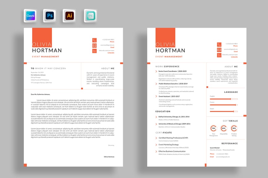 这款简历模板兼顾了影响力和可读性。它结构清晰,版式简洁,空间运用巧妙,能够帮助您以独特的风格展现您的技能、经验和个性。它可在 Adobe Illustrator 和 Photoshop 中轻松自定义,并包含配套的求职信和名片,打造一致且极具影响力的个人品牌。简洁优雅的专业简历非常适合求职申请、个人品牌推广或作品集介绍,是您在竞争激烈的市场中脱颖而出的关键。