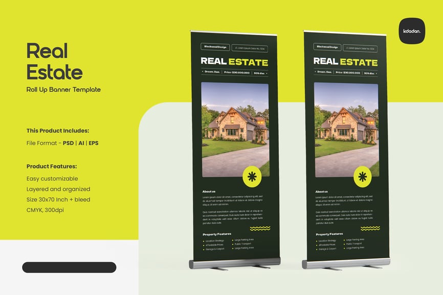 概述:简洁、现代、专业的房地产易拉宝。完全可定制,易于使用和替换颜色和文本,图像容器为智能对象,方便您添加图像和编辑文件。