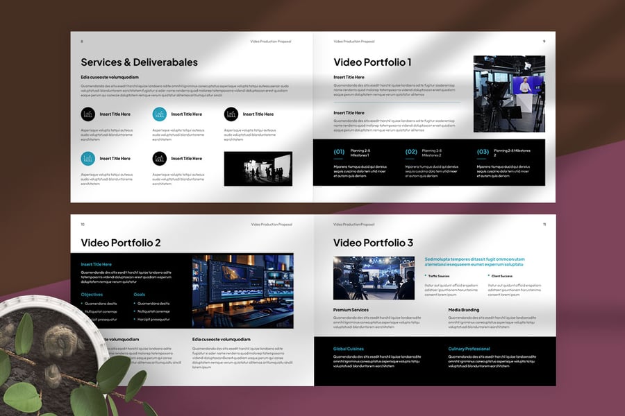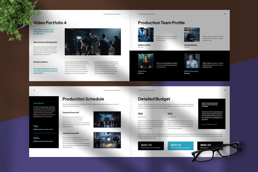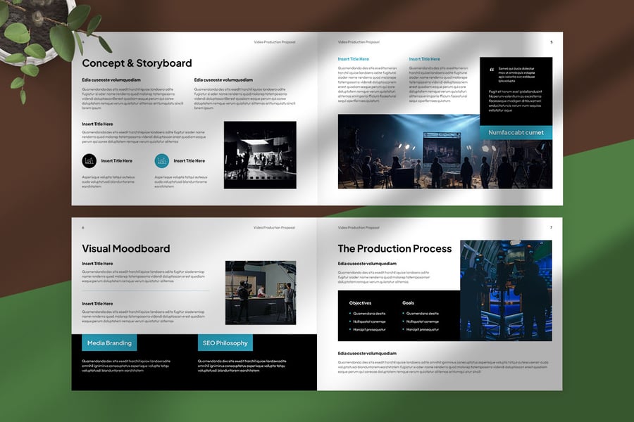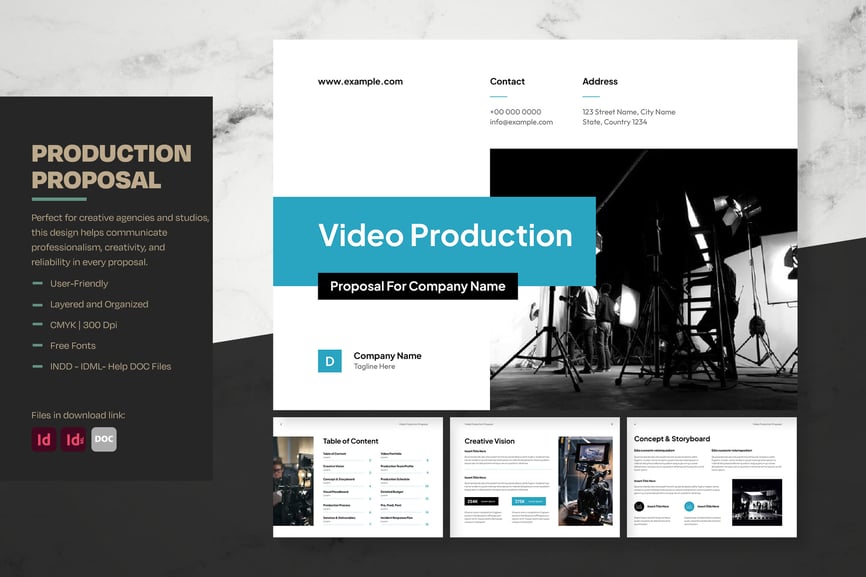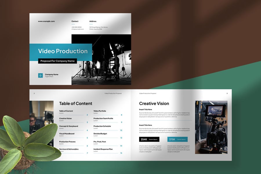 此提案模板设计简洁专业,并以醒目的蓝绿色点缀,非常适合创意工作室,帮助他们以极具影响力的方式展示其视频制作服务。其结构化的布局涵盖项目概述、概念开发、制作流程、服务交付成果、视频作品集和详细预算等部分,确保呈现清晰全面的内容。留白与粗体字体的均衡运用,营造出现代易读的流程,而蓝绿色高光则引导观众关注关键细节和重要指标。此设计非常适合创意机构和工作室,有助于在每份提案中展现专业性、创造力和可靠性。