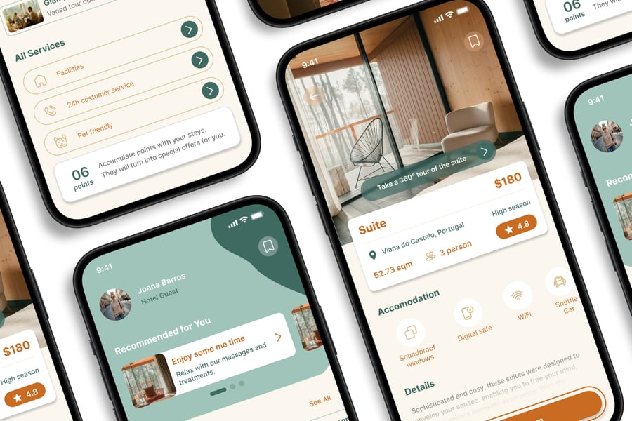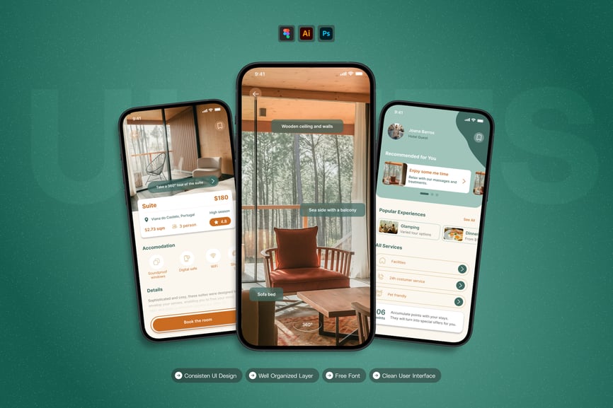 隆重推出**酒店预订**移动应用UI套件,这是一款现代化且功能全面的解决方案,可助您创建简洁易用的应用界面。对于希望加快设计流程的设计师和开发者而言,这款UI套件堪称完美之选,它将您所需的所有基本组件整合在一个井然有序的软件包中。