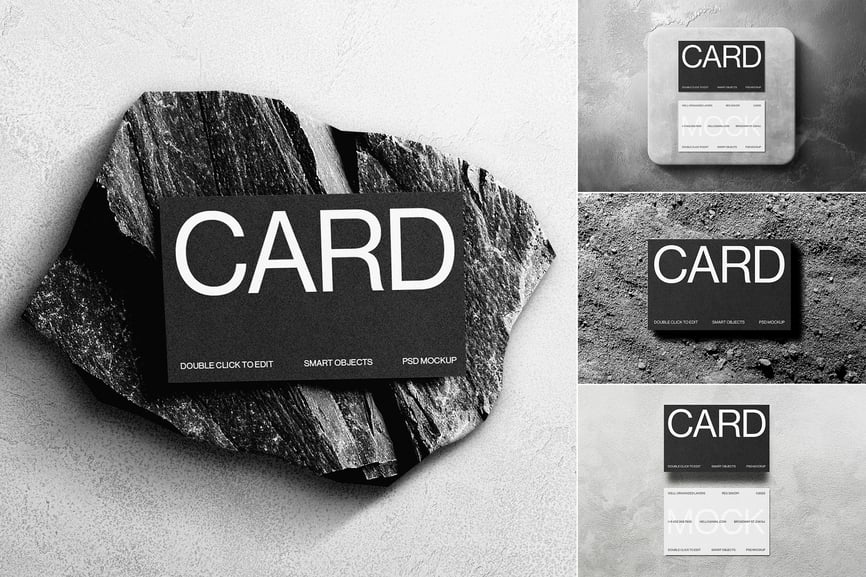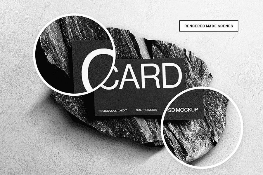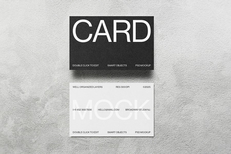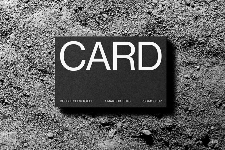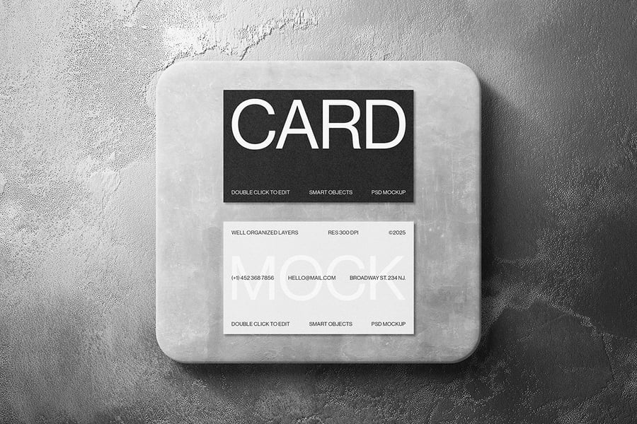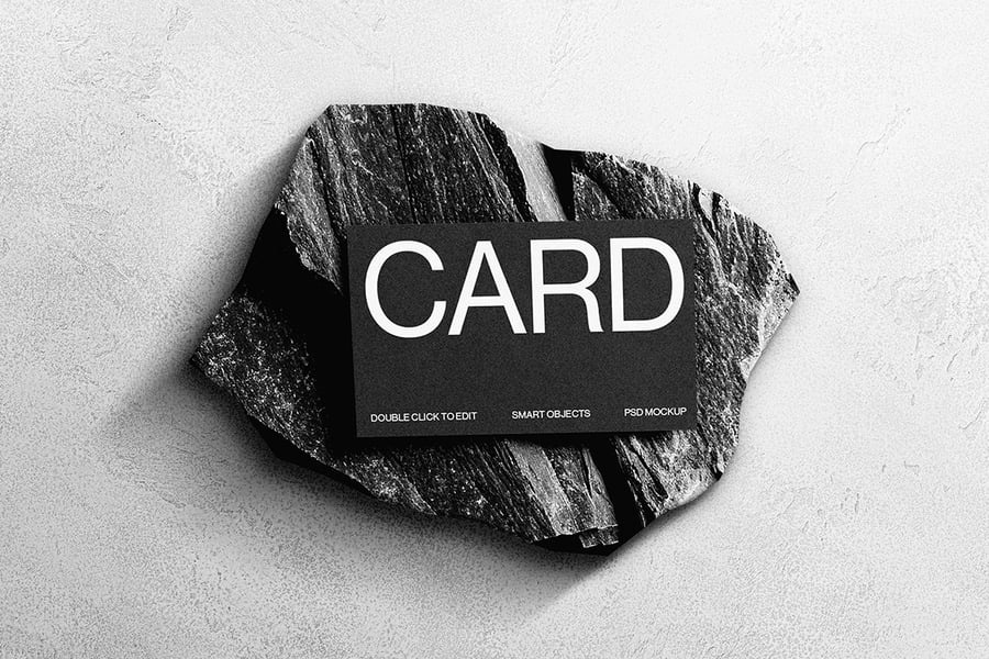 一款现代逼真的名片样机,展示在石质表面上。采用智能对象图层,方便自定义,呈现高质量效果。非常适合品牌推广、企业形象设计和专业文具设计展示。