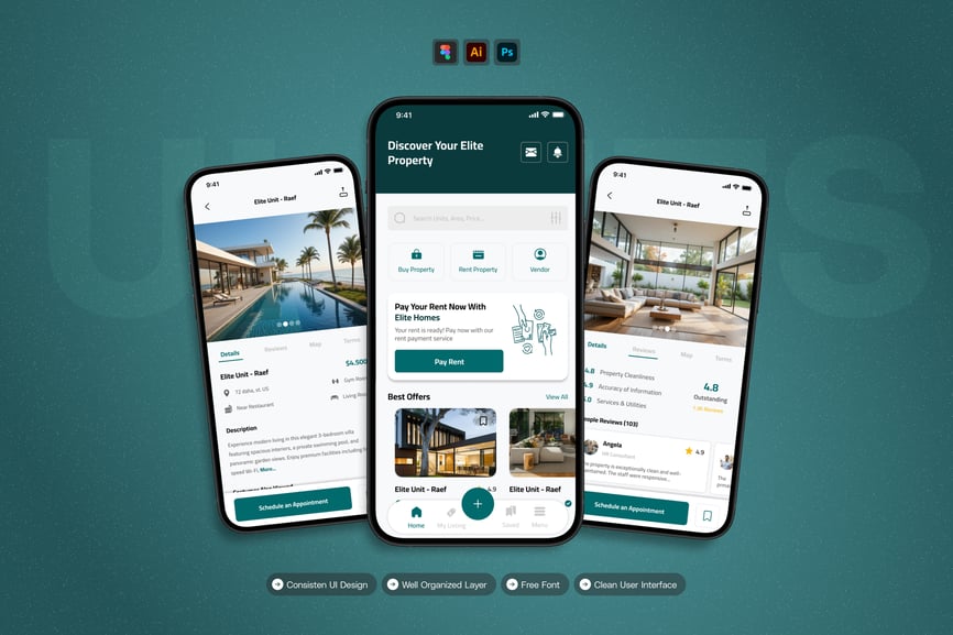 这款房地产 UI 工具包的设计重点在于易用性和一致性,让您轻松创建美观实用的移动应用程序。每个元素都经过精心构建,完全可定制,并可根据您的品牌进行调整。无论您是设计社交应用、电商应用还是效率工具,这款工具包都能让您灵活地将创意变为现实。