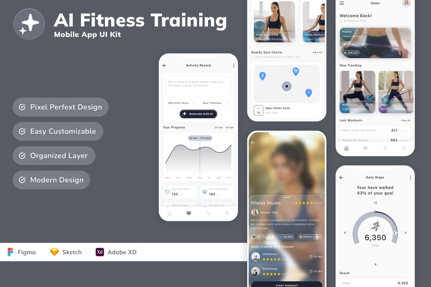 每个屏幕都可完全自定义,易于使用,并针对 Figma、Sketch 和 Adobe XD 进行了精心设计。