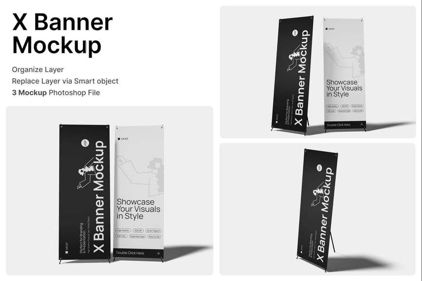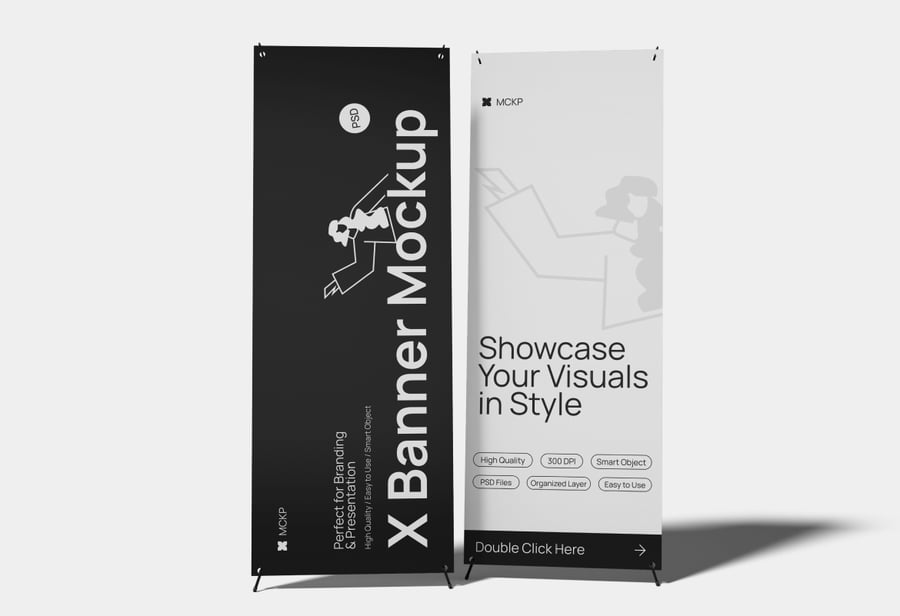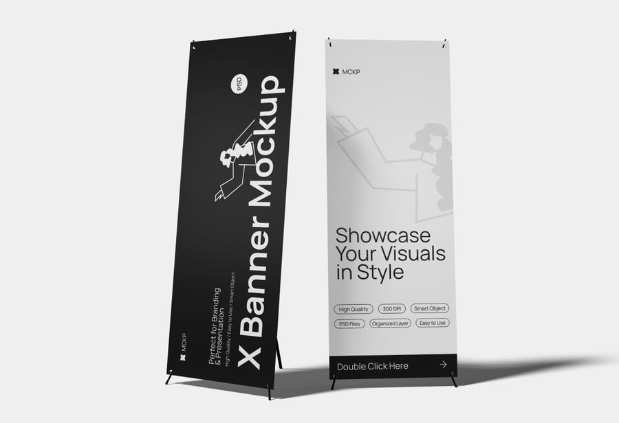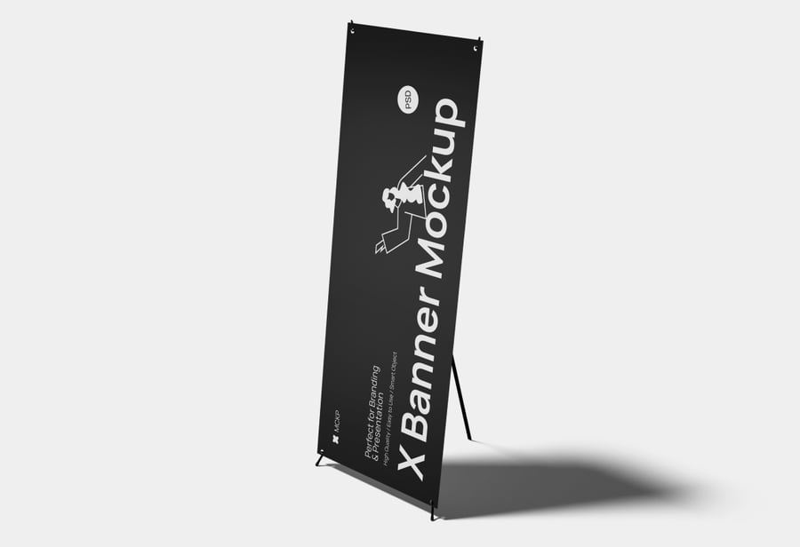 X 型横幅样机是一款专业的 Photoshop 模板,旨在以简洁逼真的方式展示促销横幅、活动视觉效果和品牌推广活动。它包含三个高质量的 PSD 场景,提供 X 型立式横幅的多个角度,让您能够以精确的比例、清晰的阴影和现代的风格展示您的设计。