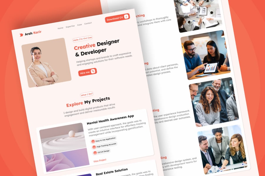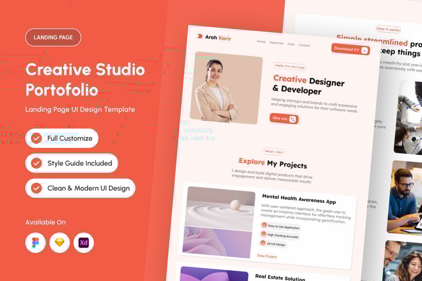 Arah Karir 是一款现代简洁的创意工作室落地页,专为希望拥有精致美观的个人作品集网站的设计师、艺术总监和自由职业者量身打造。该页面融合了企业创意风格、柔和的工作室色调和醒目的现代字体,呈现出专业而富有艺术气息的视觉效果,是展示数字作品、视觉识别项目和创意服务的理想之选。其简洁直观的界面旨在帮助用户建立强大的线上形象、提升信誉度并强化品牌形象。