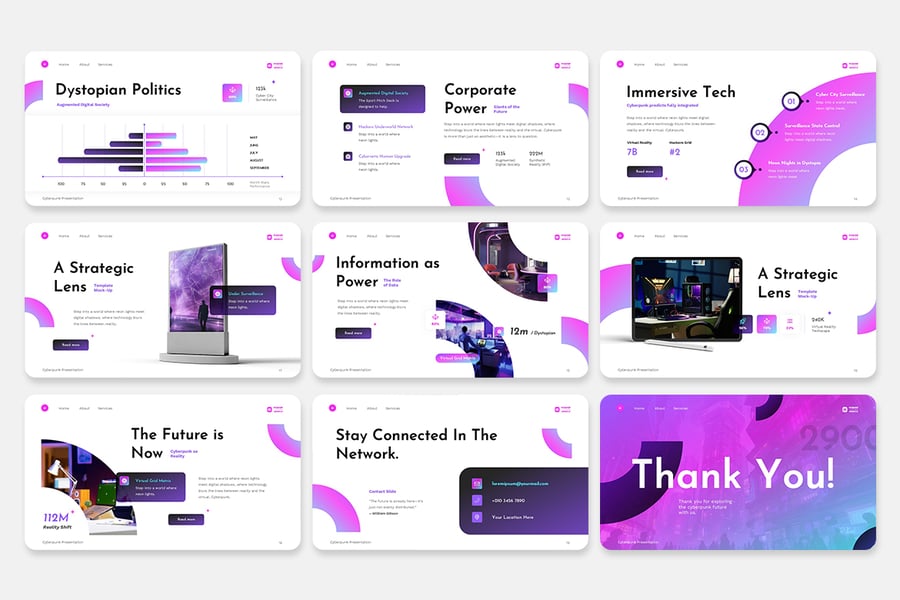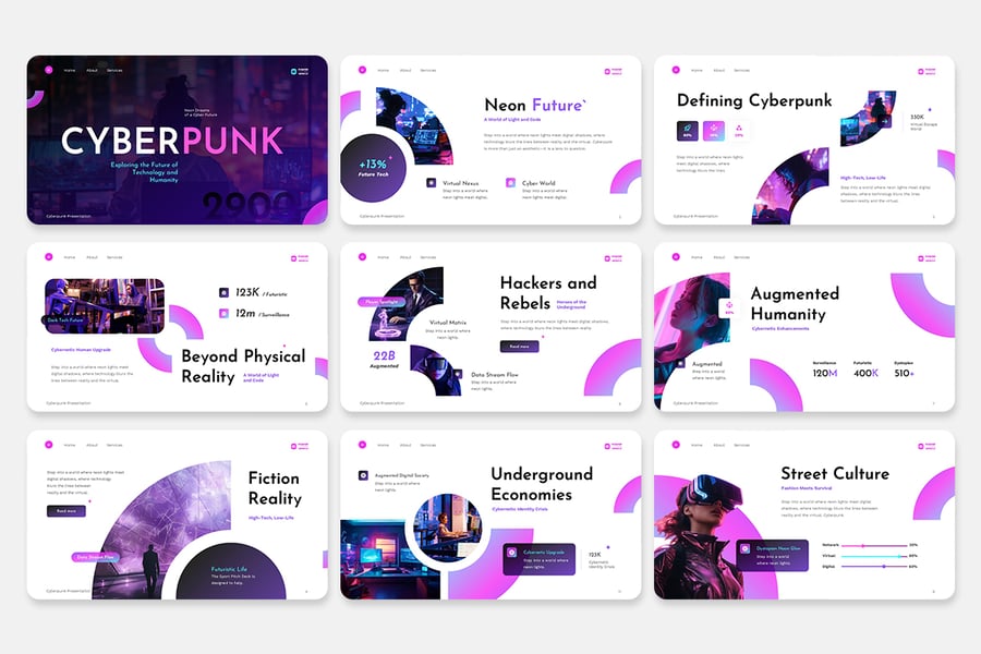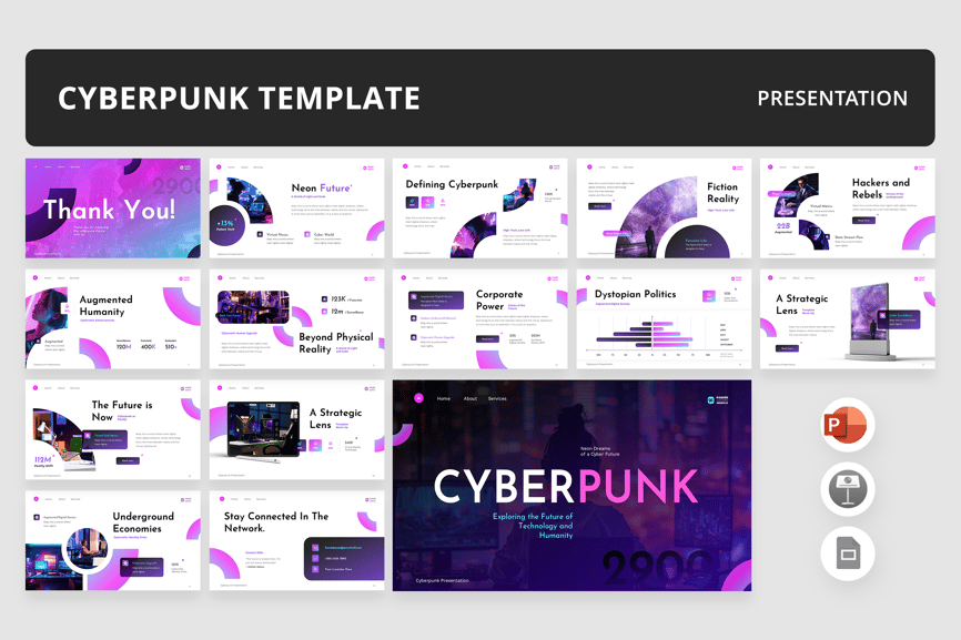使用赛博朋克科技演示模板,迈向未来,让您的演示文稿焕然一新——这是一款高科技、时尚、视觉沉浸式的布局,旨在吸引、传达信息并激发灵感。该模板专为创新者、科技领袖、初创企业、设计机构以及任何想要展现大胆未来感的人士而设计,可为您带来专业优势,让您脱颖而出。