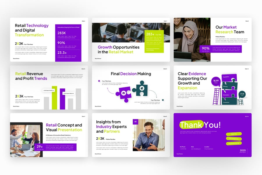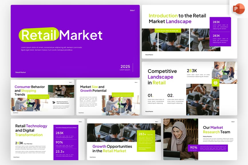 这款现代风格的 PowerPoint 模板专为零售市场研究演示而设计,拥有生动活泼且可编辑的幻灯片,涵盖消费者行为、购物趋势和数字化转型。它包含收入洞察、增长预测、竞争格局分析和市场细分等部分,并配有专业的信息图表和清晰的数据可视化。非常适合用于商业战略会议、销售绩效评估和营销规划会议。