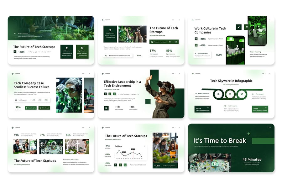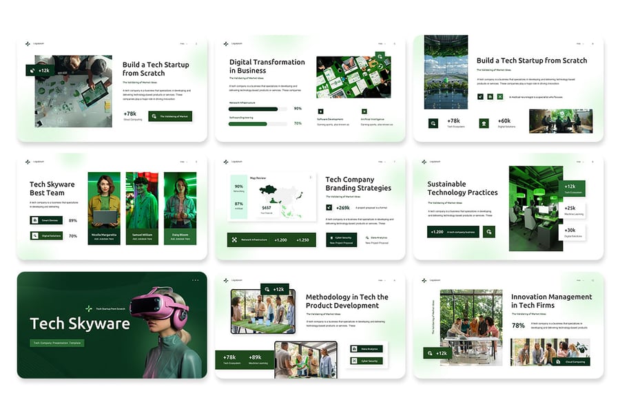 这款演示文稿模板专为科技行业量身定制——它融合了简洁的布局、醒目的字体和以数据为中心的视觉元素,确保您的信息具有权威性。该设计注重可读性和引人入胜的故事叙述。无论您要传达的是指标、产品路线图、市场分析还是团队简介,每张幻灯片都经过优化,清晰易懂,引人入胜。