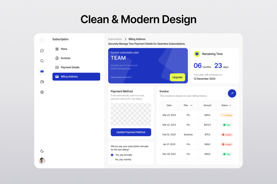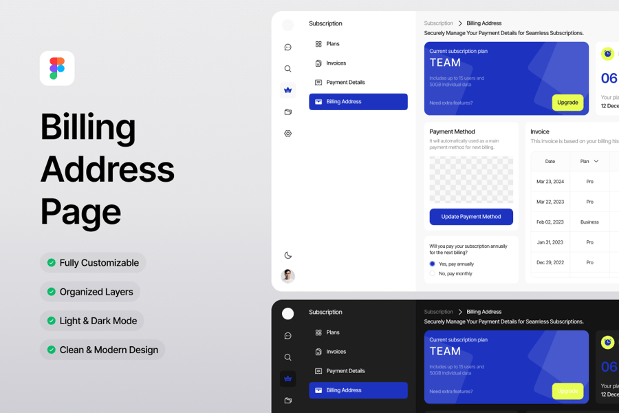账单地址页面提供了一个结构清晰、用户友好的表单,用于输入或更新账单详情。该页面字段间距清晰、逻辑分组合理,并采用简洁的矢量组件,非常适合用于结账流程、SaaS 计费或账户管理仪表板。
