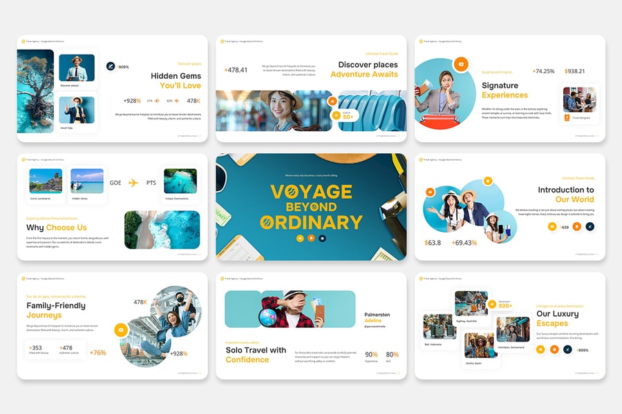 该演示模板不仅视觉上令人惊叹,而且经过精心设计,可以吸引观众,突出您的服务,并最终为您的旅游业务带来更多的销售和预订。