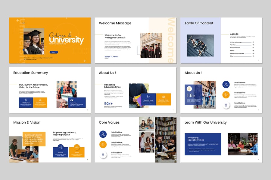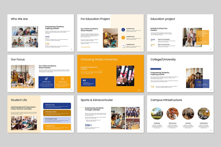 使用大学及学院演示文稿模板,以专业简洁的方式展示您的作品。这款模板设计简洁现代,功能强大,包含创意照片布局、信息图表、表格、矢量图标、图表以及大量实用功能,可将您的作品和公司简介提升到一个新的高度。