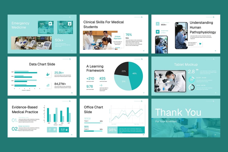 无论您是要展示医学案例研究、解剖学课程、医疗保健研究还是医院培训材料,此模板都能满足您进行有力且具有影响力的演讲所需的一切。使用此模板打造引人入胜的演讲稿,其中包含专业设计的幻灯片,可展示您业务的各个关键方面,从公司概况到问题解决方案分析。其现代化的布局、可视化的图形和可编辑的图表,让您轻松讲述故事并有效地可视化数据。它可完全定制以适应任何行业,使您能够构建吸引眼球并取得成果的演讲稿。适用于医疗保健教育演示、学术讲座和培训研讨会、医学研究和案例研究报告、解剖学和生物学教材以及医院和临床培训项目。