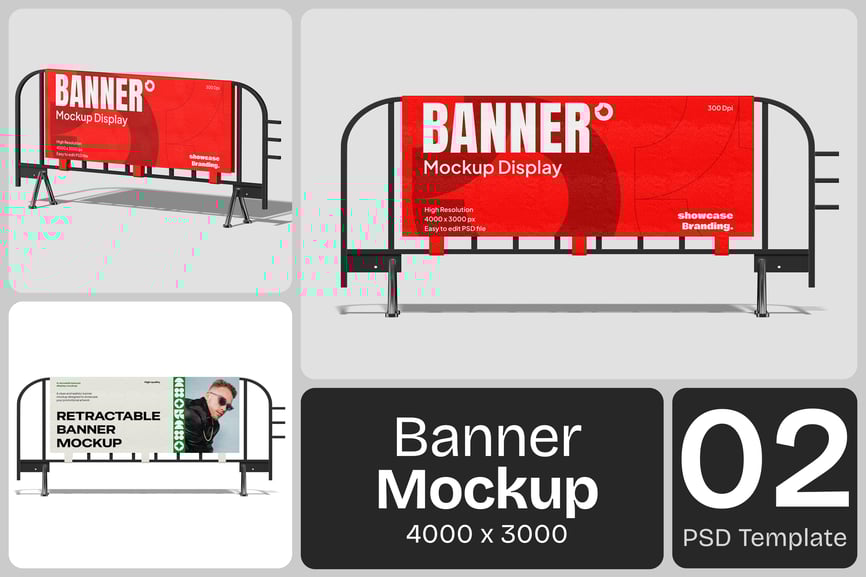 使用智能对象图层轻松插入您的作品,自定义横幅和展架颜色,并调整背景,以实现干净逼真的垂直展示效果。