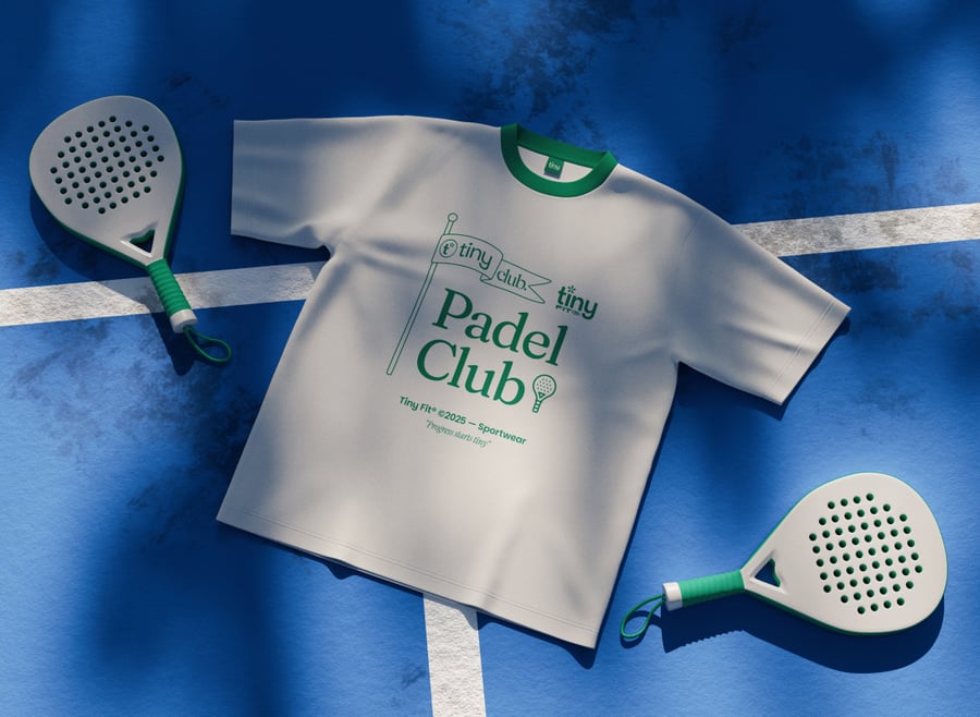 用这款**俯视视角T恤样机**捕捉比赛日的氛围。一件T恤平铺在**亮蓝色板式网球场**上,周围环绕着球拍、球鞋和网球。强烈的顶灯营造出鲜明的阴影和高对比度——完美展现运动街头服饰、活力系列或充满动感的板式网球周边产品。