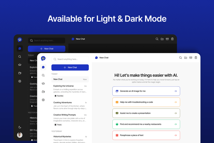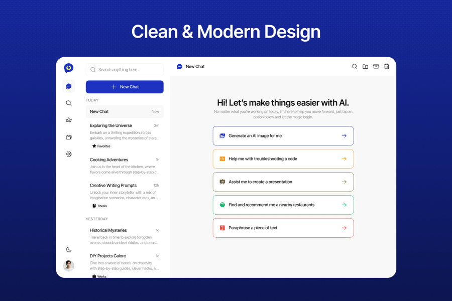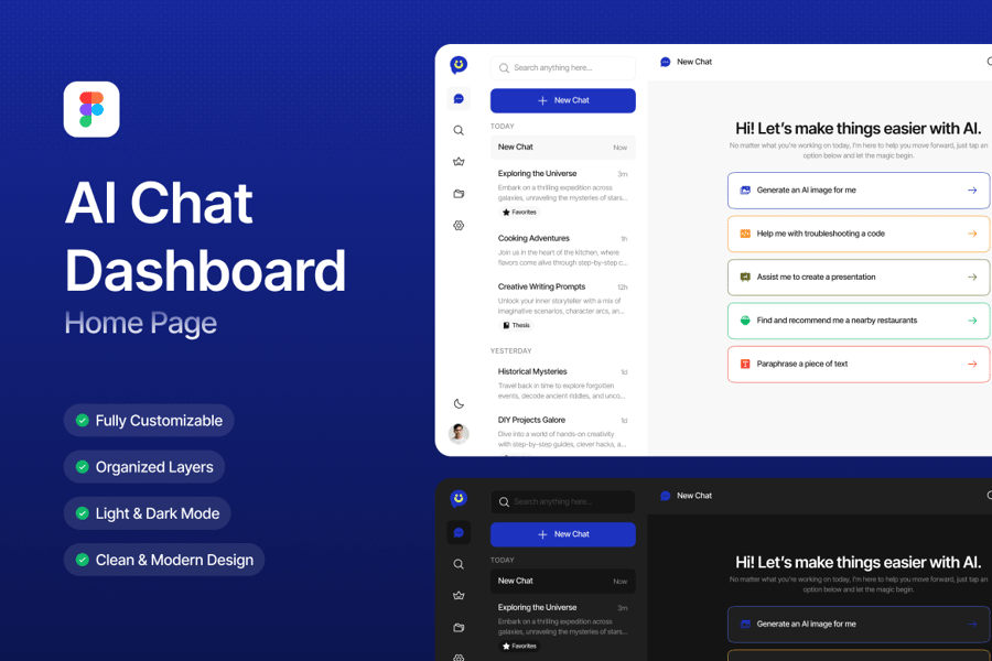 隆重推出 AI 聊天仪表盘主页,这是一款专为 AI 工具、聊天助手和效率平台打造的现代化界面。该布局以清晰性和高性能为设计核心,拥有简洁的消息流、侧边栏导航、快捷操作和智能回复建议。