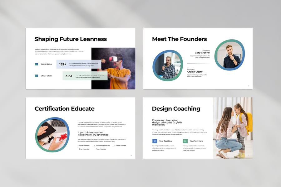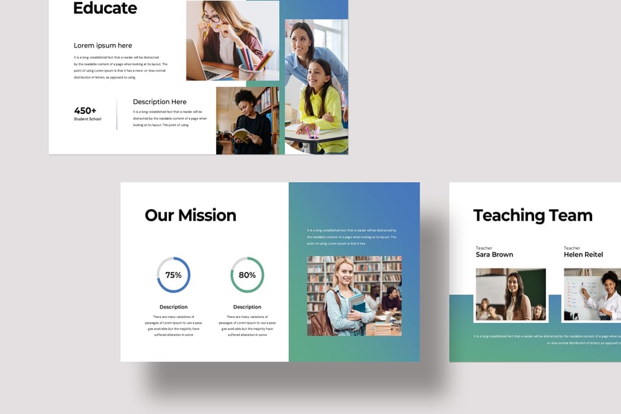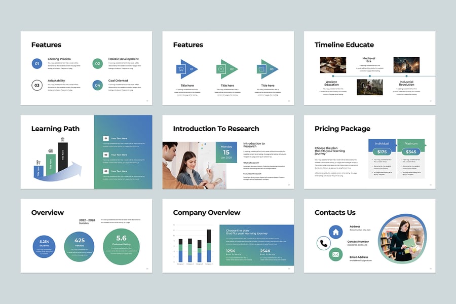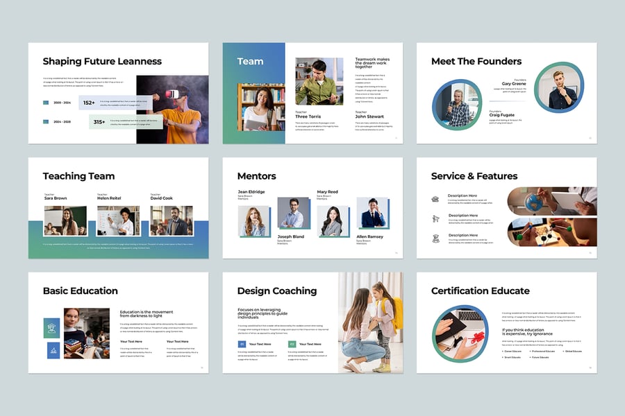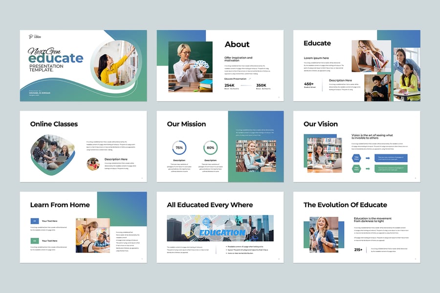 使用 NextGen Educate 演示模板,以专业简洁的方式展示您的作品。这款模板设计简洁现代,功能强大,包含创意照片布局、信息图表、表格、矢量图标、图表以及大量实用功能,可将您的作品和公司形象提升到一个新的高度。