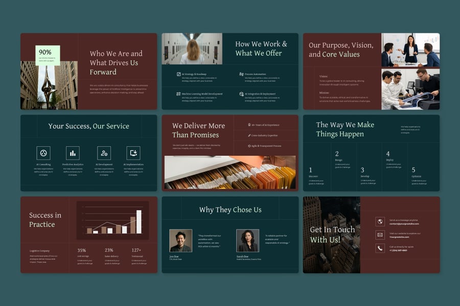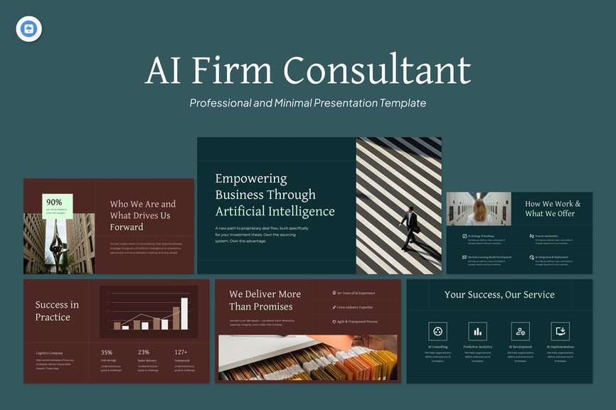 AI 咨询公司演示模板 Keynote 是一款简洁正式的演示文稿,专为技术咨询公司、AI 顾问和数字化转型专家设计。该模板采用绿色和栗色的均衡配色方案,将专业性与创新性融为一体,非常适合在高风险商业环境中建立信任。