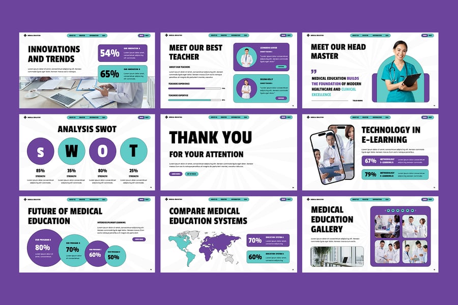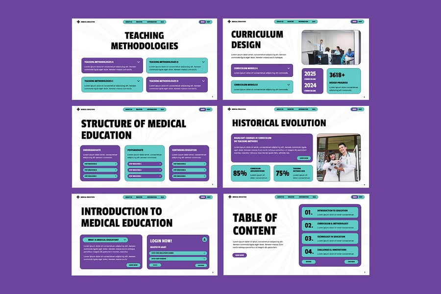 使用这款专业的医学教育 Google 幻灯片演示模板,提升您的医学培训和医疗保健教育水平。这款简洁现代的模板专为医疗专业人士、教育工作者、学生和机构设计,提供完全可编辑的幻灯片,非常适合讲座、研讨会、研究演示和学术会议。这款医疗保健演示模板包含各种视觉效果引人入胜的幻灯片,例如解剖图、案例研究布局、信息图表、图表和比较表。它针对医学教学、健康意识宣传活动、医院培训课程和临床教育内容进行了优化。