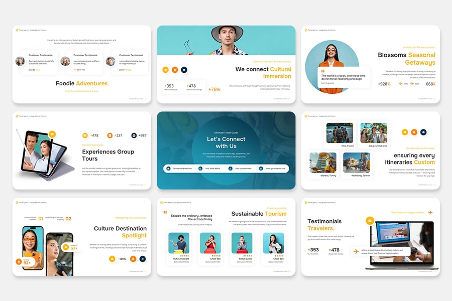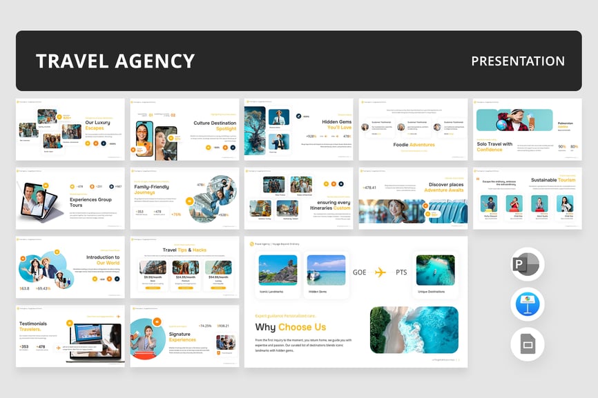 该演示模板不仅视觉上令人惊叹,而且经过战略性设计,可以吸引观众,突出您的服务,并最终为您的旅游业务带来更多的销售和预订。