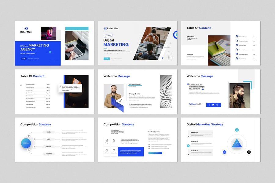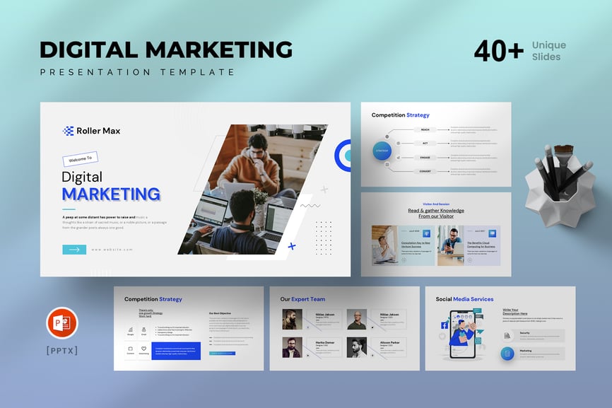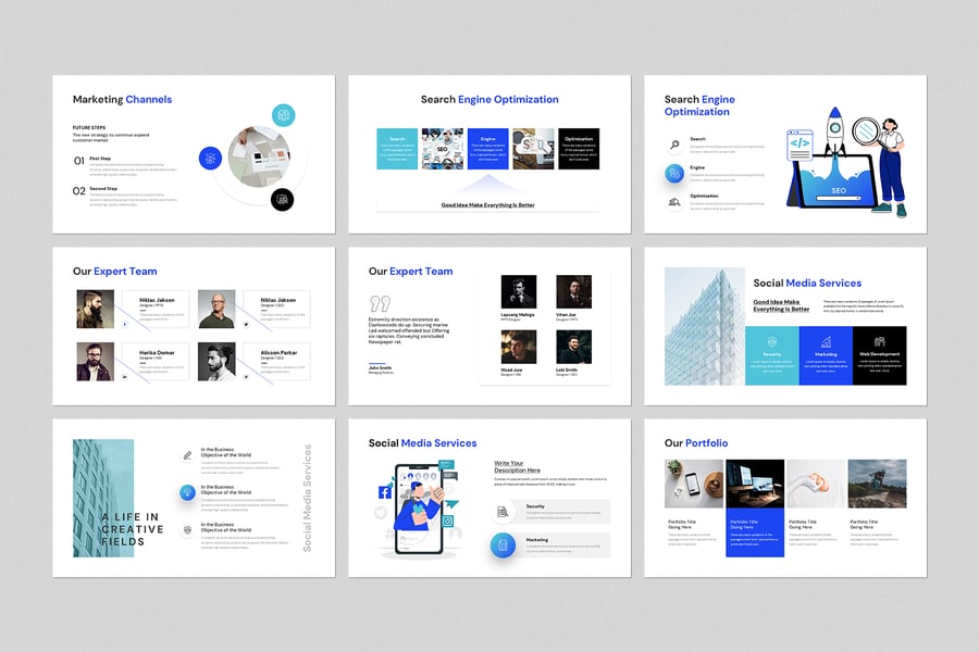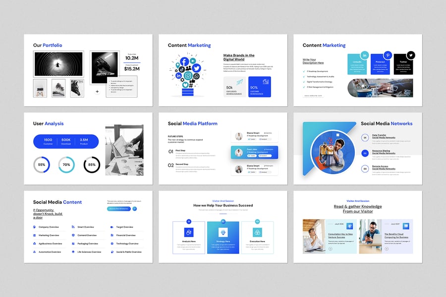 数字营销演示风格模板,满足您独特、专业、简洁、创意十足的演示需求。所有幻灯片均采用精美的风格设计。所有元素均可轻松编辑,您可以轻松更改颜色,以匹配您的个人或公司品牌。