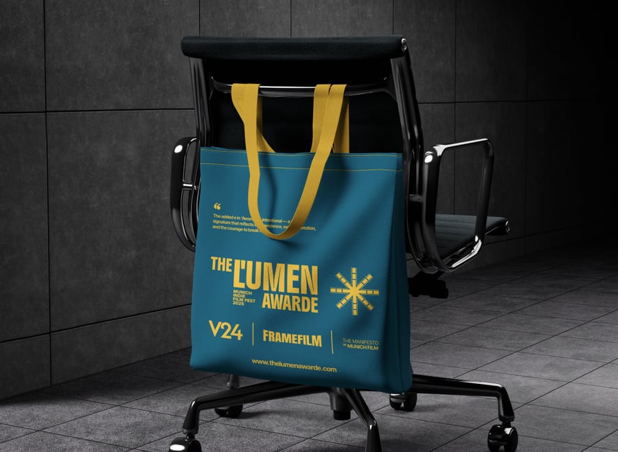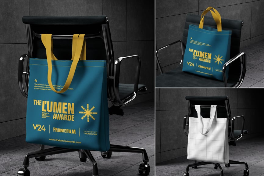 这款逼真的帆布手提袋样机,置于充满戏剧张力的室内环境中,完美展现您的设计。主图的正面特写突显了面料纹理和印花细节,而略微倾斜的中景镜头则增添了层次感和自然垂坠感。背景中,深灰色纹理墙面、深色地板和简约的办公椅营造出现代感十足的电影工作室氛围——是高端商品、时尚配饰或企业礼品品牌推广的理想之选。