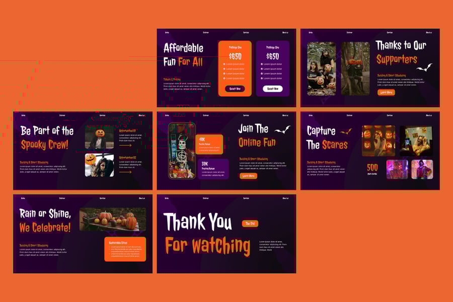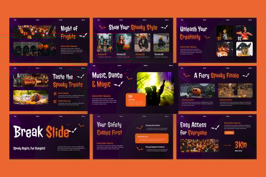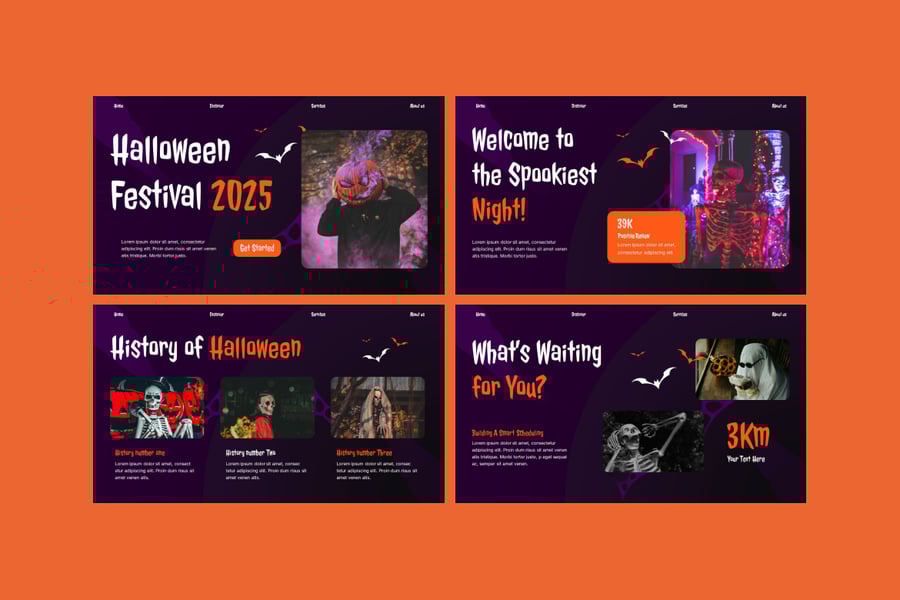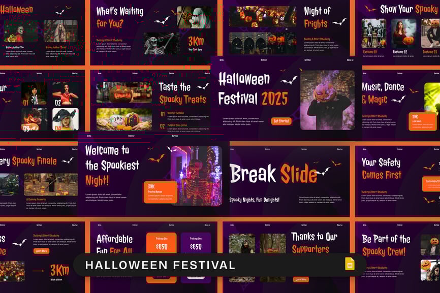使用万圣节 Google 幻灯片演示模板,以怪异而又专业的设计吸引观众——非常适合让您的季节性演示令人难忘。