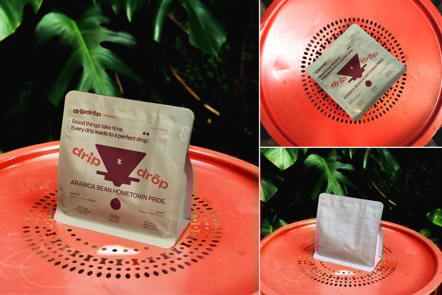 用这款**充满活力的立式咖啡包装袋样机**,让您的咖啡品牌焕发活力。两个**牛皮纸咖啡包装袋**分别从**俯视和中景角度**展示在**带孔橙色托盘**上,周围环绕着翠绿的叶子。自然的户外光线和生机勃勃的植物营造出明亮而充满活力的场景——非常适合精品烘焙商、环保品牌或给人清新宜人感觉的生活方式包装。