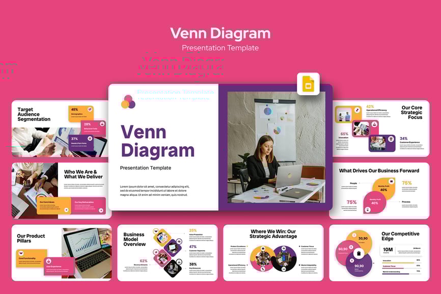 维恩图 Google 幻灯片模板旨在以清晰、结构化的方式呈现不同概念之间的比较、重叠和关系。它包含用于数据分析、业务战略、项目规划和概念图的预置图表布局。每张幻灯片均可完全自定义,让您能够以专业的视觉效果突出显示相似之处、差异之处和共同点。