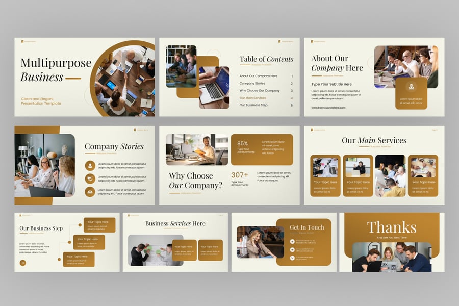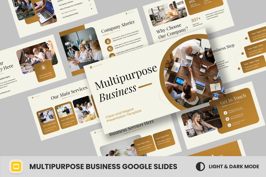 使用 Google Slides 版本的多用途商务演示文稿,打造极具影响力且用途广泛的演示。该演示文稿设计灵活,融合了简洁的布局、现代化的视觉效果和专业的结构,确保您的信息能够跨越行业和受众群体,引起共鸣。