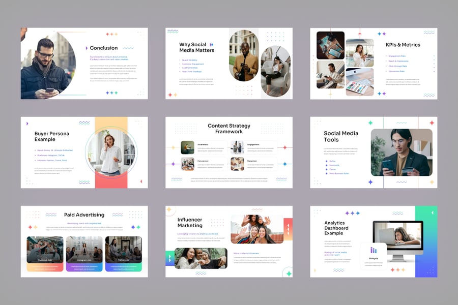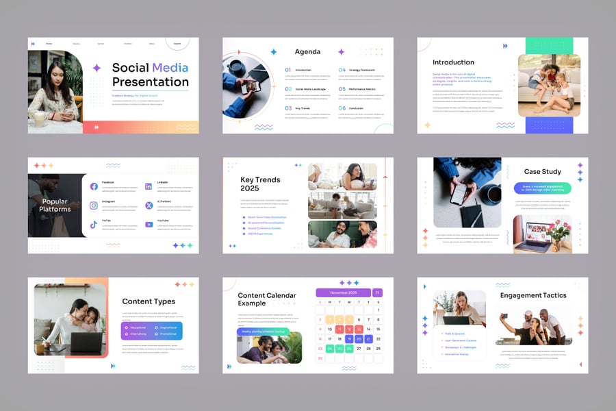 这款社交媒体提案演示模板专为营销机构、创意团队以及希望制定或展示具有影响力的数字营销策略的公司而设计。它包含活动目标、内容日历、平台分析、KOL拓展和广告策略等幻灯片,确保涵盖社交媒体计划的所有关键领域。专业而富有创意的布局使其既适用于面向客户的宣传册,也适用于内部营销提案。代理机构可利用它展示活动策略和绩效分析,而企业则可对其进行调整,以制定全公司范围的互动计划。该设计融合了简洁的视觉效果和现代风格,使受众洞察、预算和指标等复杂数据易于理解。这款模板非常适合数字营销、企业品牌推广、初创公司和创意机构,可帮助团队清晰自信地展示其策略。无论是用于新客户提案还是内部规划,它都能提升您的社交媒体叙事能力。