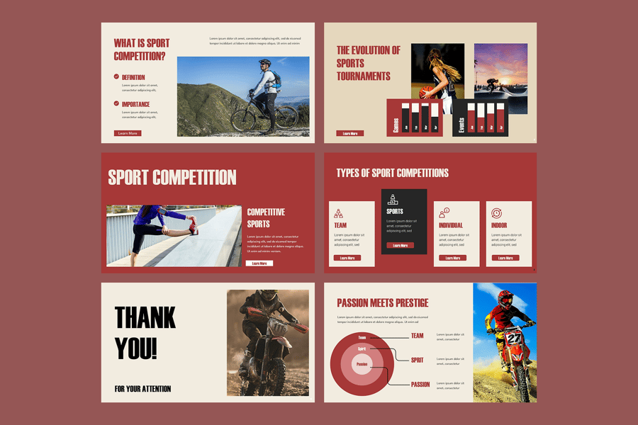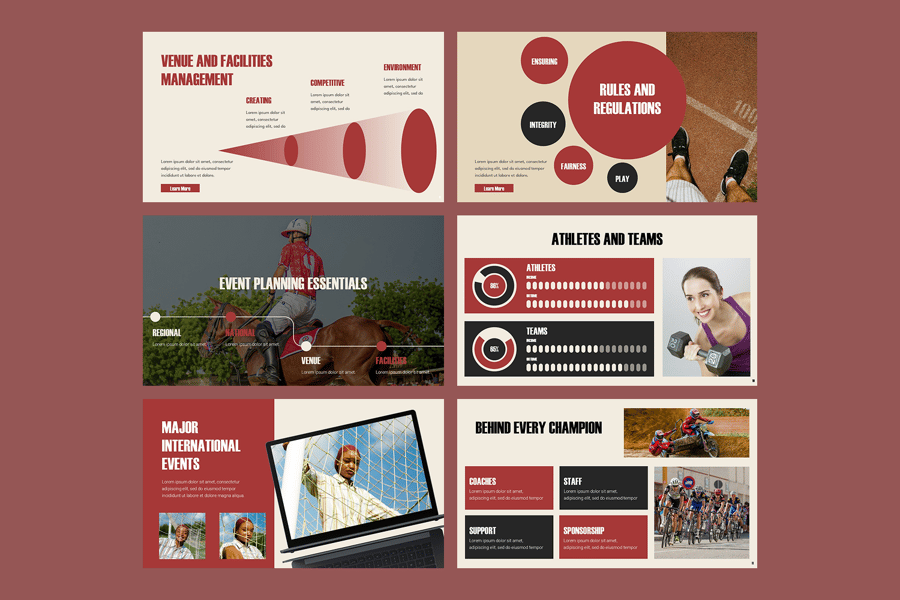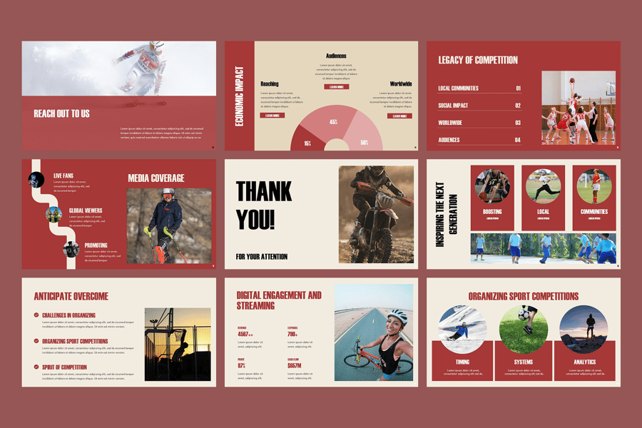 这款体育赛事演示模板设计动感十足,旨在以激动人心且专业的方式展示各项赛事、团队亮点和活动详情。它非常适合体育俱乐部、学校、赛事组织者、体育协会和赞助商使用,包含赛事介绍、比赛规则、团队和运动员简介、赛程安排、锦标赛分组、实时比分、赞助机会和颁奖典礼等版块。模板采用动感十足的布局、运动感十足的图形、醒目的字体和引人入胜的信息图表,既展现了竞技精神,又保持了演示的清晰性和冲击力。该模板功能全面且可定制,是赛事推广、体育营销、赛事策划或赛后报告的理想之选,是激发观众热情、颂扬体育卓越成就的完美工具。