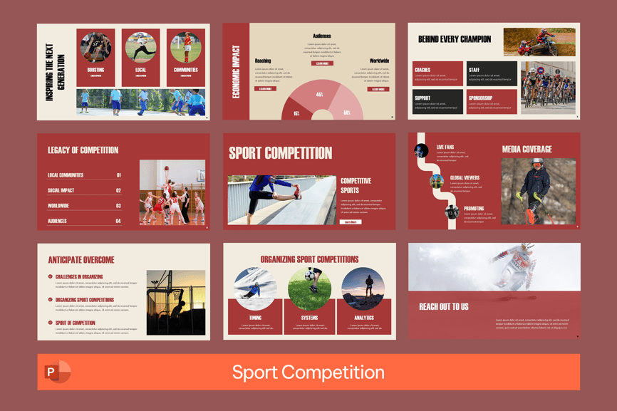 **应用场景:** 赛事展示、冠军赛演示文稿、足球赛事幻灯片、篮球模板、电子竞技比赛、体育联赛、体育赛事、团队比赛日程、体育机构