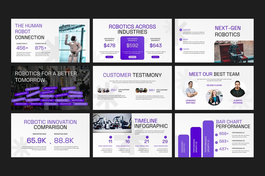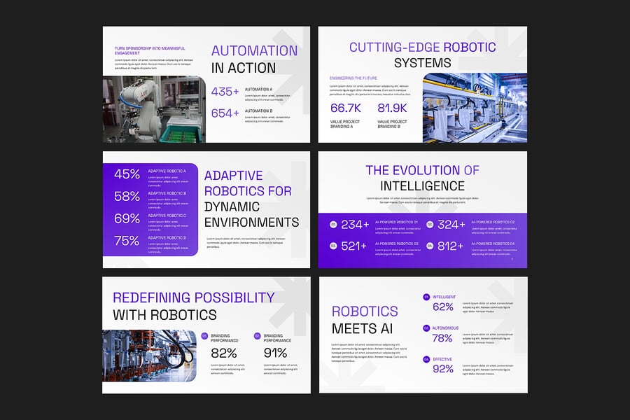 使用机器人创新 PowerPoint 演示模板,将未来科技带入生活。这款时尚现代的幻灯片专为机器人、人工智能、自动化、机器学习和先进科技行业设计。该模板非常适合初创公司、研究人员、工程师、教育工作者和企业展示前沿创新成果,它将未来主义的设计元素与简洁的布局完美融合,吸引观众。该模板包含完全可编辑的幻灯片、矢量图标、信息图表、数据图表和设备模型,您可以以专业且视觉上引人入胜的方式展示机器人项目、自动化策略、人工智能突破和研究成果。